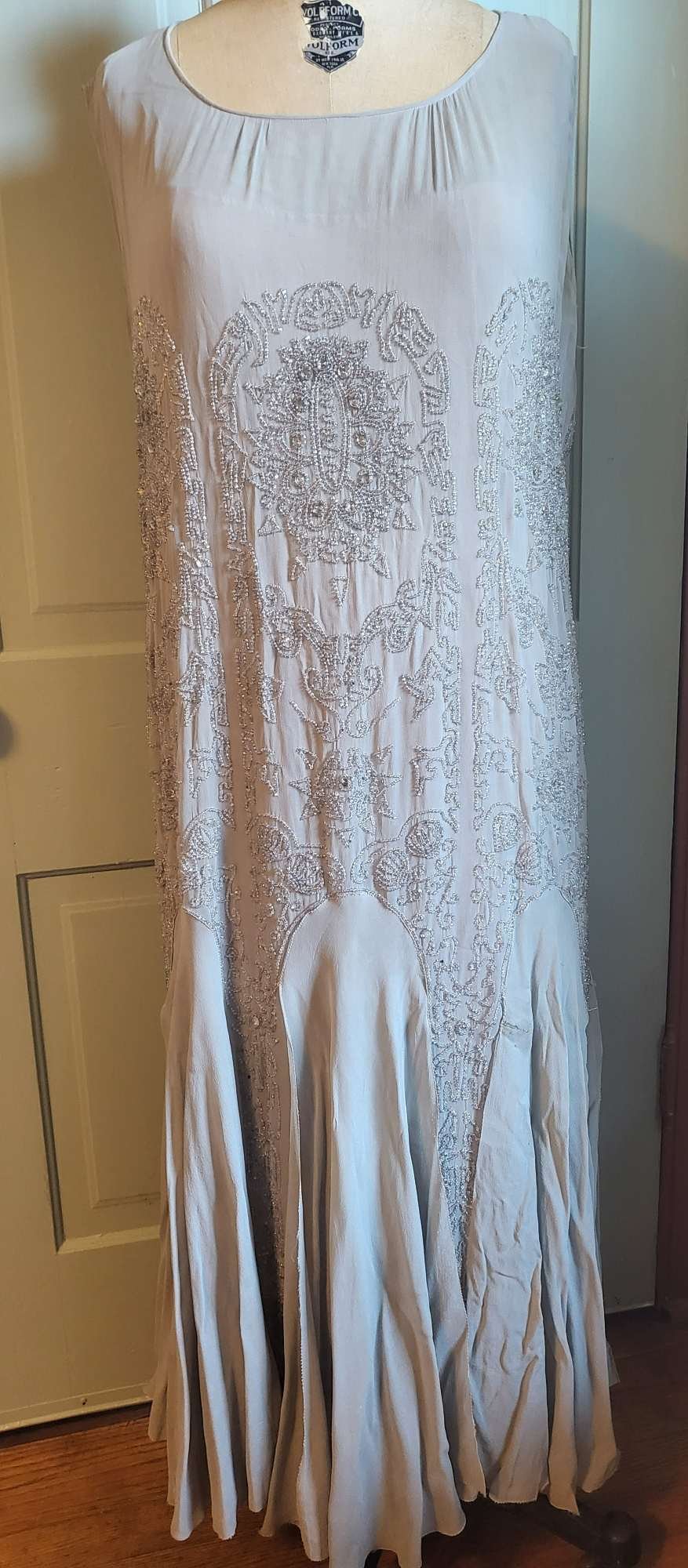 Beautiful twenties dance dress very heavily beaded with clear seed beads and large circular clear glass beads on gray silk georgette. The gored skirt has flaps of chiffon over the underskirt.